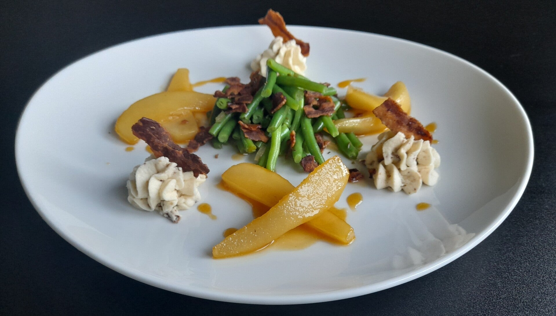 Birnen, Bohnen und Speck - ein norddeutscher Klassiker in der kalten Jahreszeit. Aber die frischen Bohnen sind schon ab Juli aus heimischer Ernte verfügbar, warum dann nicht das Ganze mal als lauwarme Vorspeise servieren?