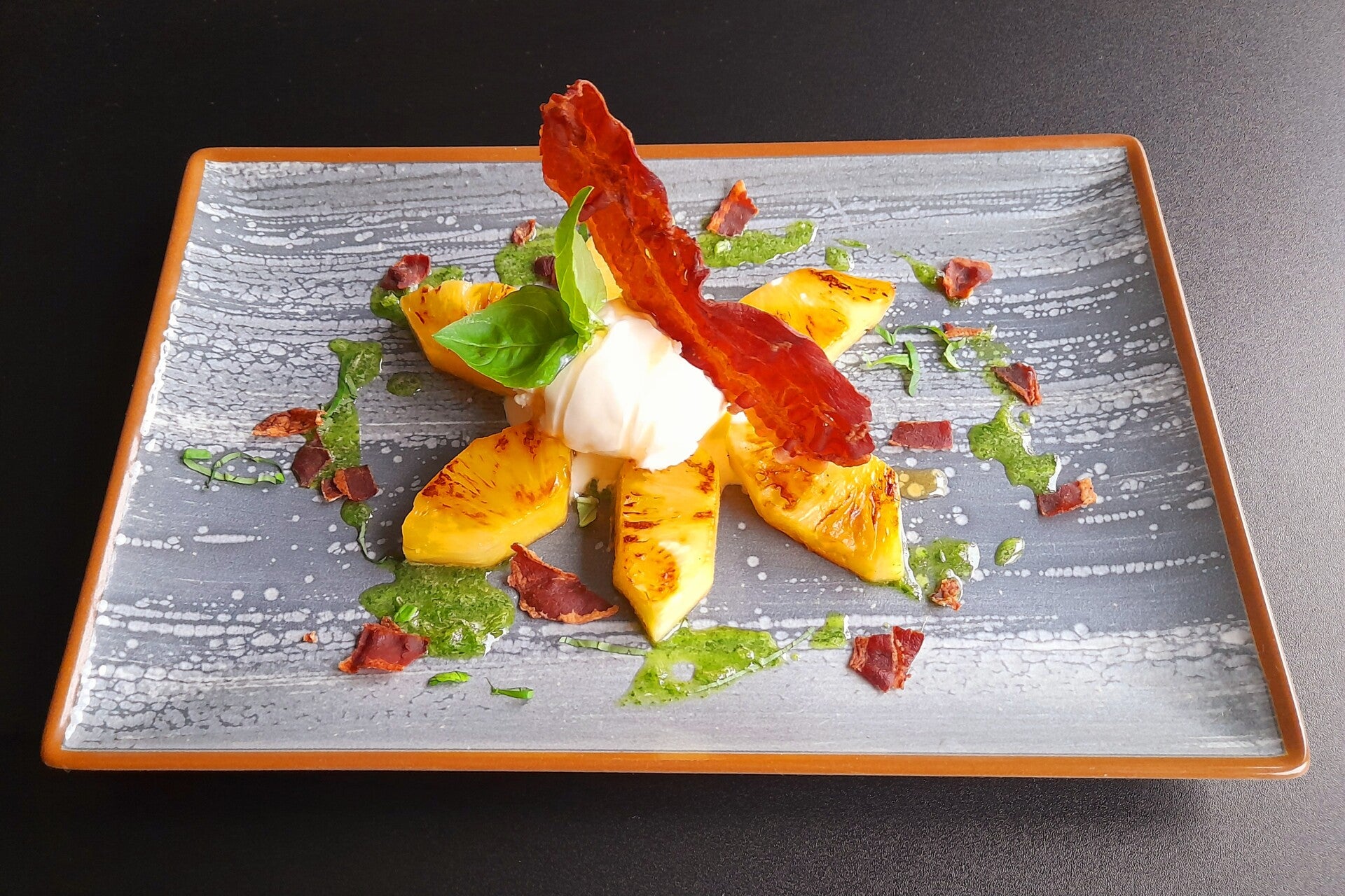 Die Ananas kommt reif und frisch auf den Teller: kurz in der Pfanne karamellisiert, so dass ihre natürliche Süße betont und durch zarte Röstnoten ergänzt wird. Das Basilikum bringt eine grüne Frische und hebt die tropische Fruchtsäure fein hervor.